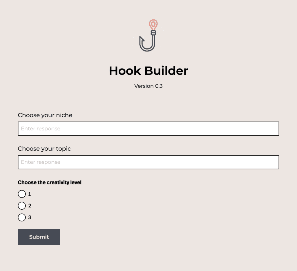 This hook building tool should be used as inspiration to write better hooks, not write you hook for you. It should give you a variety of ideas and styles to base your hook on, the rest is up to you.